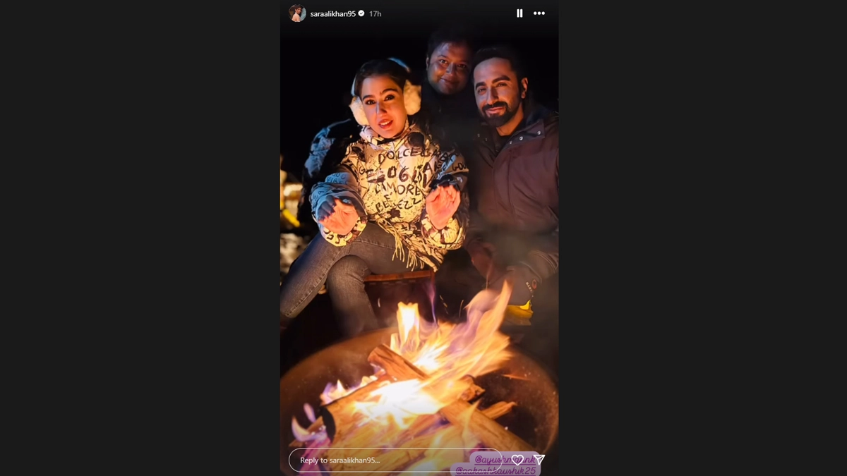 Sara is seen posing with Ayushmann and director Aakash in front of a bonfire. Sara wore a printed hoodie that teamed up jeans and earmuffs, while Ayushmann opted for black puffer jacket.
