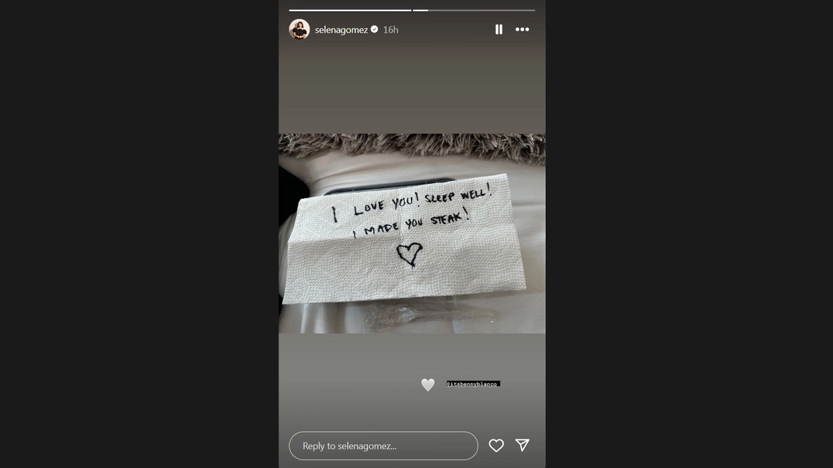 American singer and songwriter Selena Gomez shared a picture of a romantic tissue paper note she received from her boyfriend Benny Blanco, reported People. Taking to her Instagram stories, she posted a picture of the note and tagged the music producer. "I Love You! Sleep Well! I Made You Steak!," read the note. The Instagram update came from Gomez after the couple attended one of cookbook author Jake Cohen's Passover seders earlier this month. In Cohen's post, the couple can be seen smiling as they sat by a dinner table alongside friends including comedian Eric Andre. Selena Gomez Confirms Relationship With Benny Blanco, 'Baby Calm Down' Singer Shares Pic On Insta!.