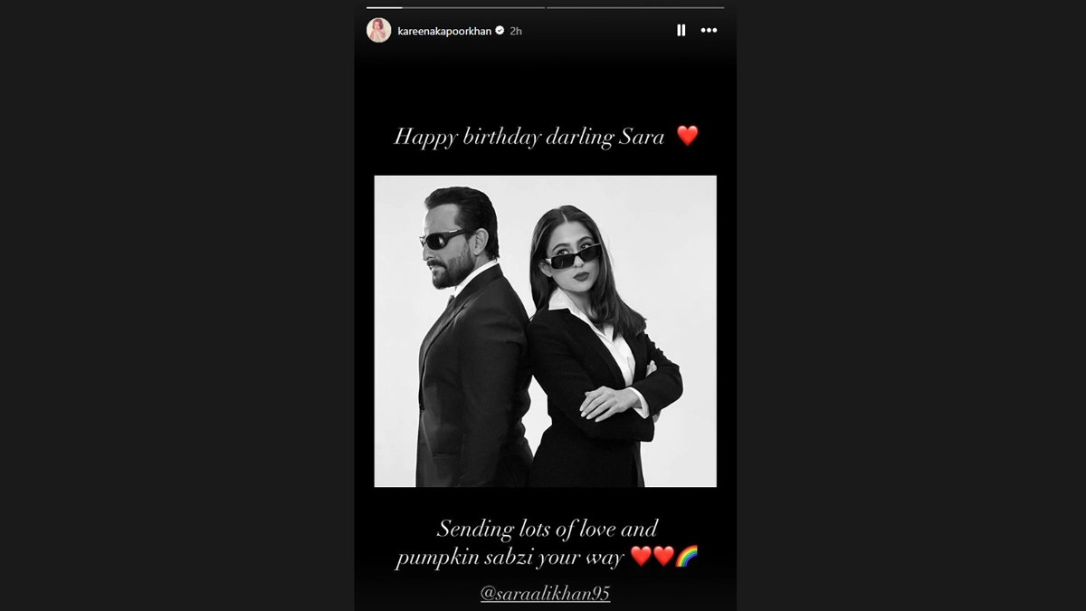 In a heartwarming gesture, Kareena Kapoor Khan took to Instagram to wish Sara Ali Khan a very happy 29th birthday. Bebo shared a throwback black-and-white photograph featuring Sara and her father, Saif Ali Khan, from an earlier photoshoot. Alongside the image, Kareena wrote, "Happy birthday darling Sara. Sending lots of love and pumpkin sabzi your way," with heart emojis. Born to actors Saif Ali Khan and Amrita Singh, Sara Ali Khan turned 29 on Monday. Sara Ali Khan Birthday Special: Did You Know the Actress Has ‘Fake’ Instagram Account? (Watch Video).
