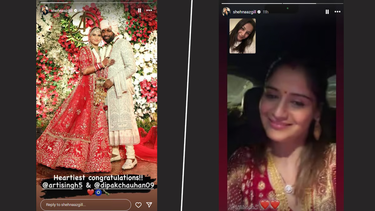 Bigg Boss 13's Arti Singh stepped into a new chapter of her life as she tied the knot with Dipak Chauhan in a beautiful ceremony marked by traditional charm.Amidst the celebrations, one heartfelt gesture stole the limelight as her dear friend Shehnaaz Gill extended warm wishes through a video call. Despite being unable to attend the wedding, Shehnaaz made sure to make her presence felt by reaching out to Arti on her special day. Sharing smiles and joyous vibes, the duo exchanged congratulations, creating a memorable moment amidst the wedding festivities. Shehnaaz, who shared a picture of the newlyweds and a screenshot of their video call, expressed her happiness for Arti, adding a touch of warmth to the occasion. Arti Singh Ties the Knot With Beau Dipak Chauhan in Mumbai; First Photo of Newlyweds Out!.
