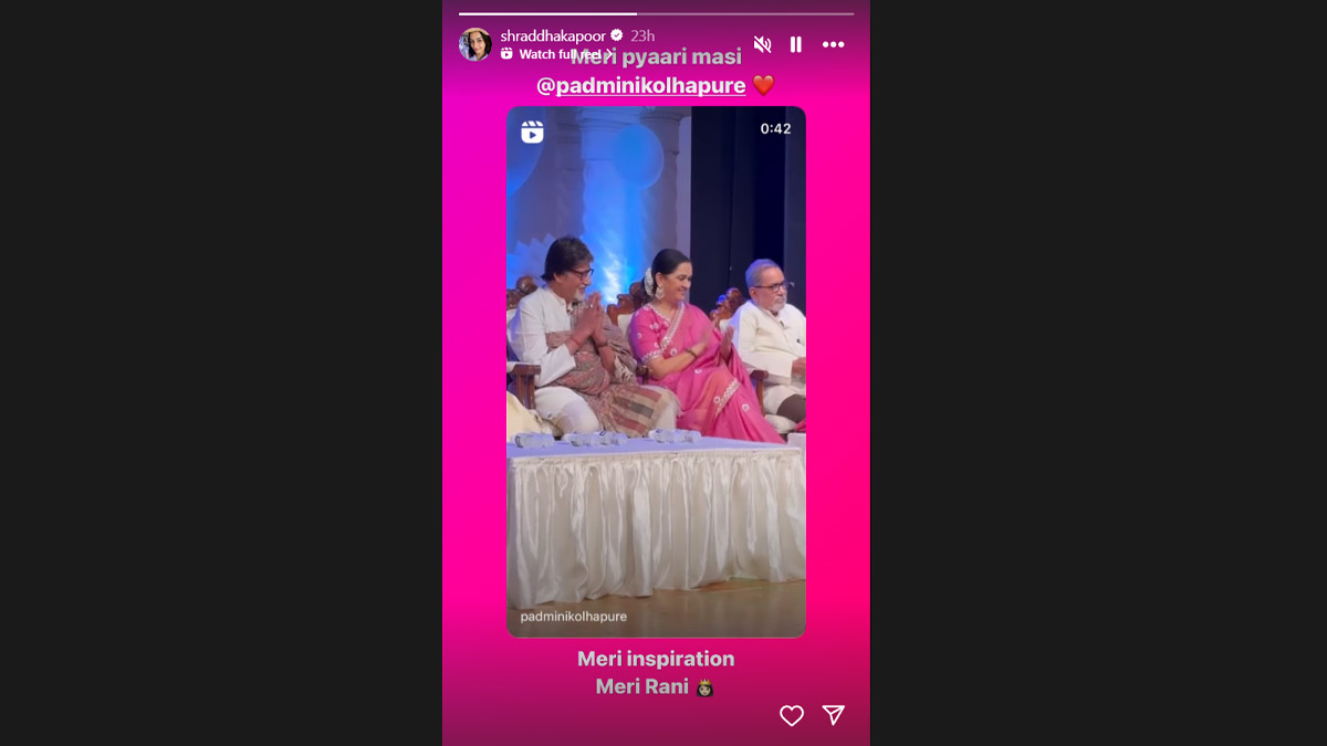Actor Shraddha Kapoor, who never misses an opportunity to shower love on her family members, recently showed her love and admiration for her aunt, actress Padmini Kolhapure, who received the Lata Deenanath Mangeshkar Award. Taking to her Instagram Stories on Monday, the actress shared Padmini Kolhapure's video expressing her affection and admiration for her aunt with the caption, "Meri Pyaari Masi, meri inspiration, meri rani with a heart emoji." Shraddha Kapoor Chills With Her Furry Friends, Shares Adorable Pics on Insta!.