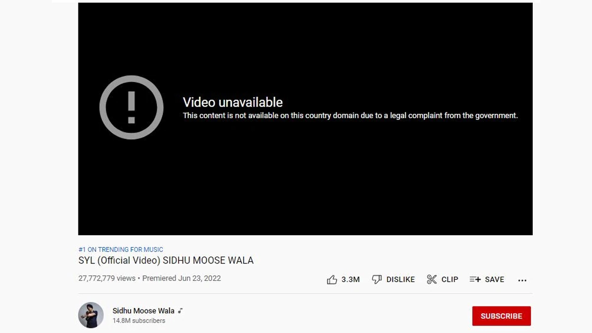Composed by Sidhu Moose Wala before he was shot dead on May 29, the music video was released by producer MXRCI on Friday, June 23 on YouTube. However, on clicking the link of the video, a message gets displayed now, saying, "This content is not available on this country domain due to a legal complaint from the government." Sidhu Moose Wala New Song SYL Out! Late Singer’s Music Video Highlights Various Issues Happening In Punjab - WATCH.