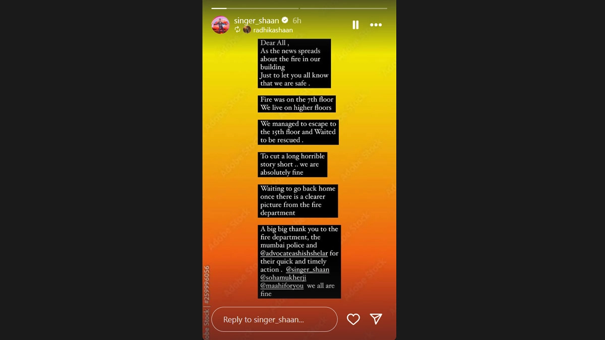 Singer Shaan has reassured fans about his safety after a massive fire broke out at his Bandra residence on Tuesday. Shaan on Tuesday took to his Instagram to share details on the incident and confirmed that everyone in his family is safe. Fire at Shaan’s Residential Building: Blaze Erupts at Bollywood Singer’s Apartment Building in Mumbai, Brought Under Control; Video Shows Thick Smoke Billowing.