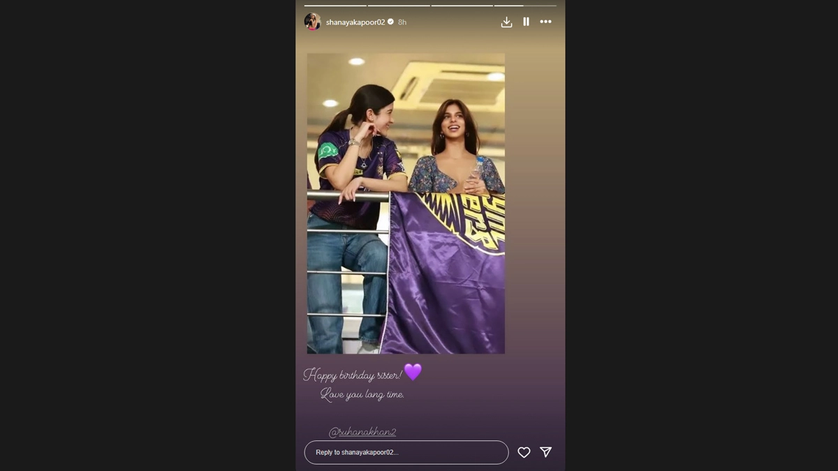 Star couple Shah Rukh Khan and Gauri Khan's daughter Suhana Khan turned a year older on Wednesday. Making her feel special on her special day, her close friends Ananya Panday and Shanaya Kapoor posted adorable birthday wishes on their social media handles. Shanaya dropped a candid picture with Suhana from one of the IPL matches of KKR. The image has Shanaya adorably looking at Suhana while they cheered for KKR. " Happy birthday sister (purple heart). Love you long time," she captioned the post. Ananya's post also features a picture from KKR's IPL match. Suhana Khan Birthday Special: A Sneak Peek Into Her Saree Wardrobe That Spells Exquisite and Glam (View Pics).
