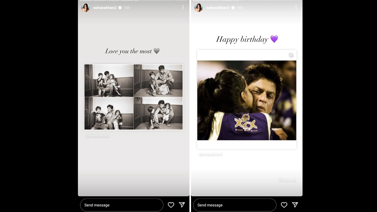 Superstar Shah Rukh Khan is celebrating his birthday today. On this special occasion, his daughter and actor Suhana Khan posted some throwback pictures with him on her Instagram stories. In the picture, she can be seen giving a peck on her dad's cheek. She wrote in the caption, "Happy Birthday.She also shared a collage of throwback pictures with her father Shah Rukh Khan and brother Aaryan Khan. Along with the pictures she expressed her love for her dad and mentioned, "Love you the most." Superstar Shah Rukh Khan rang in his 58th birthday with a bang. He greeted his fans who had gathered outside his residence 'Mannat' in Mumbai to wish their favourite actor.After meeting his fans, SRK in the early hours of Thursday, took to X (formerly Twitter) to express gratitude to fans for all the sweet birthday wishes. Shah Rukh Khan's Daughter Suhana Khan Sends Heartfelt Birthday Wishes with Precious Throwback Moments.