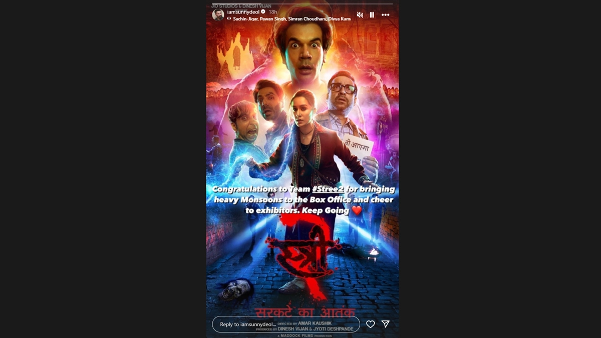 Actor Sunny Deol recently congratulated the team of Stree 2 for the film's tremendous success at the box office. Sunny Deol, who experienced a similar success with his film Gadar 2 last year, shared his excitement for Stree 2 on social media. Taking to his Instagram stories on Thursday, the actor poster the movie's poster and wrote an encouraging note to the cast and crew. "Congratulations to team Stree 2 for bringing heavy monsoons to the box office and cheer for exhibitors, read his note. ‘Stree 2’ Success Bash: Shraddha Kapoor and Rajkummar Rao Celebrate Film’s Box Office Triumph (View Pics).