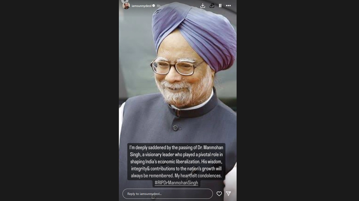 In an Instagram post, he remembered Manmohan Singh as a "visionary leader". "I'm deeply saddened by the passing of Dr. Manmohan Singh, a visionary leader who played a pivotal role in shaping India's economic liberalization. His wisdom, integrity& contributions to the nation's growth will always be remembered. My heartfelt condolences. #RIPDr ManmohanSingh," Sunny wrote.