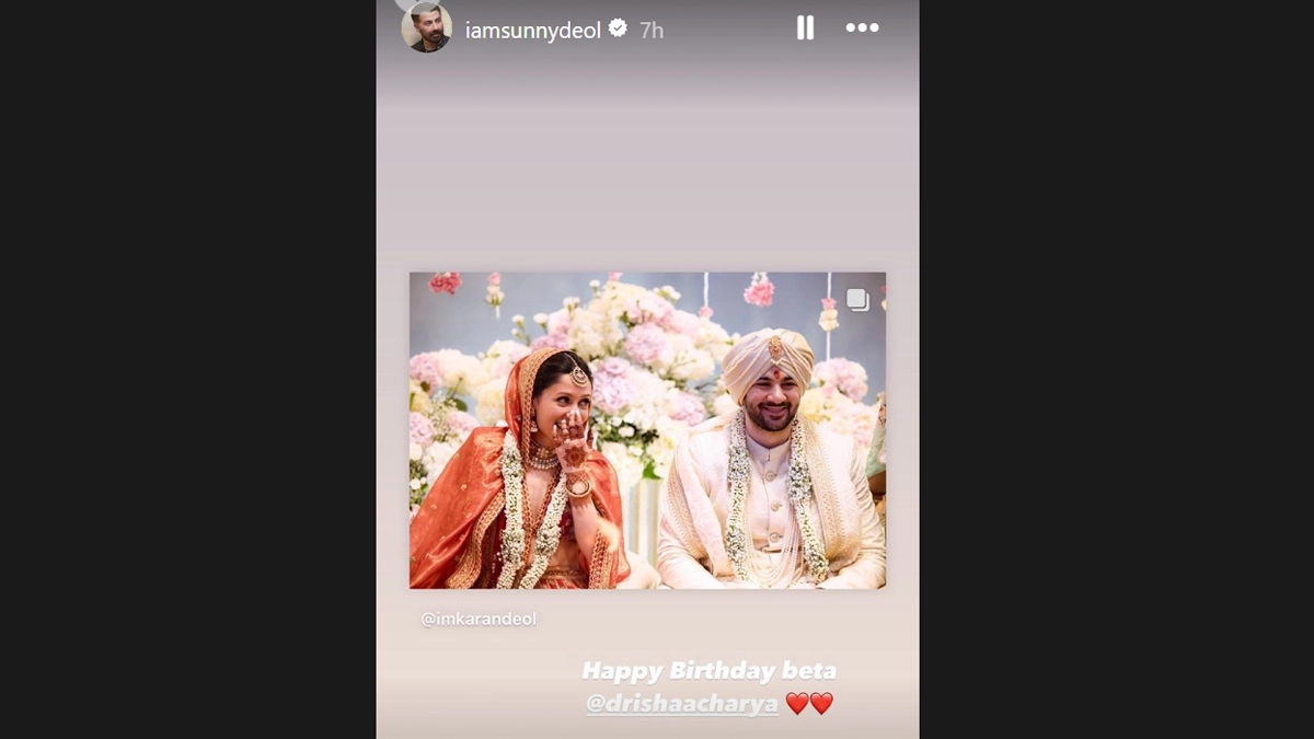 Actor Sunny Deol on Sunday extended a heartfelt birthday wish for his daughter-in-law Drisha Acharya. Taking to Instagram, Sunny shared a picture of Drisha and Karan from their wedding on his stories that he captioned, "Happy birthday beta @drishaacharya," followed by two red heart emoticons. Sunny Deol Strikes a Cute Pose With a Teddy Bear As He is All Set to Film Lahore 1947 (View Pic).