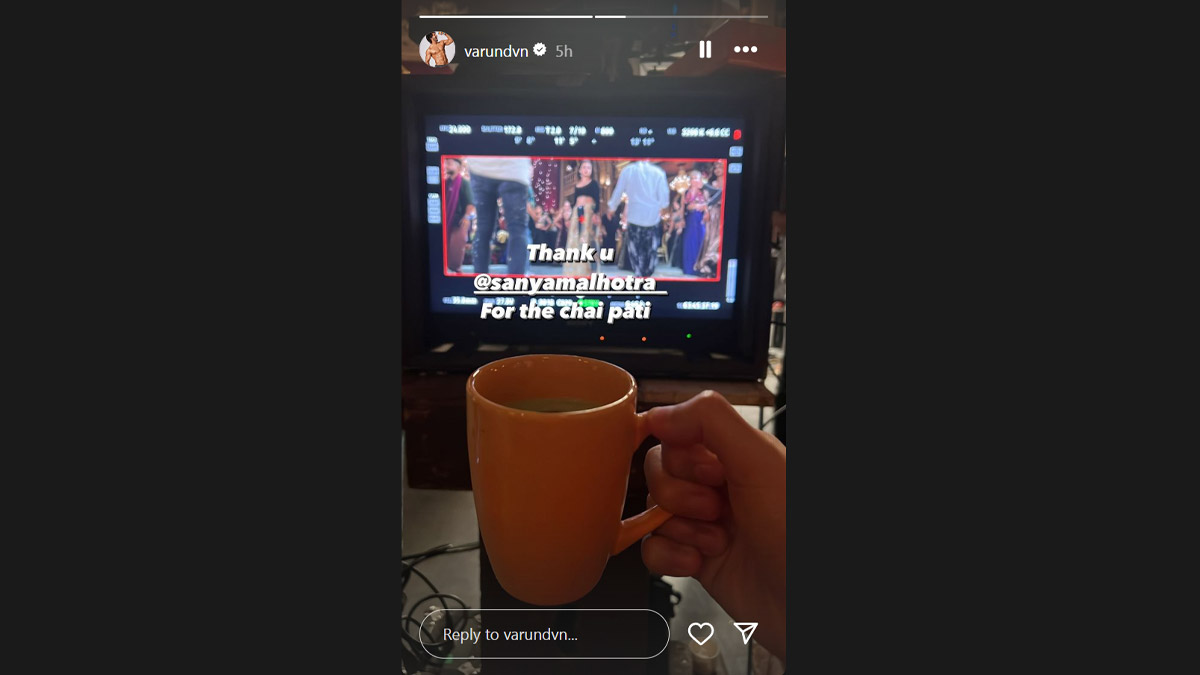 Varun Dhawan shared a picture on Friday of himself enjoying a cup of tea on the sets of his upcoming romantic film Sunny Sanskari Ki Tulsi Kumari. He also thanked his co-star Sanya Malhotra for "chai pati." Taking to Instagram stories, Varun treated fans with a glimpse of the film set. Varun is not visible in the image, he is seen holding a cup in his hand while he sat in front of a screen and watched the filming of the scenes. Sharing the picture, he wrote, Thank u @sanyamalhotra For the chai pati." Re-sharing Varun's post on her Instagram stories, Sanya posted, "You're welcome VD." 'Sunny Sanskari ki Tulsi Kumari' is written and directed by Shashank Khaitan. ‘Baby John’: Salman Khan To Make Special Cameo in Varun Dhawan-Atlee’s Upcoming Action Thriller – Reports.