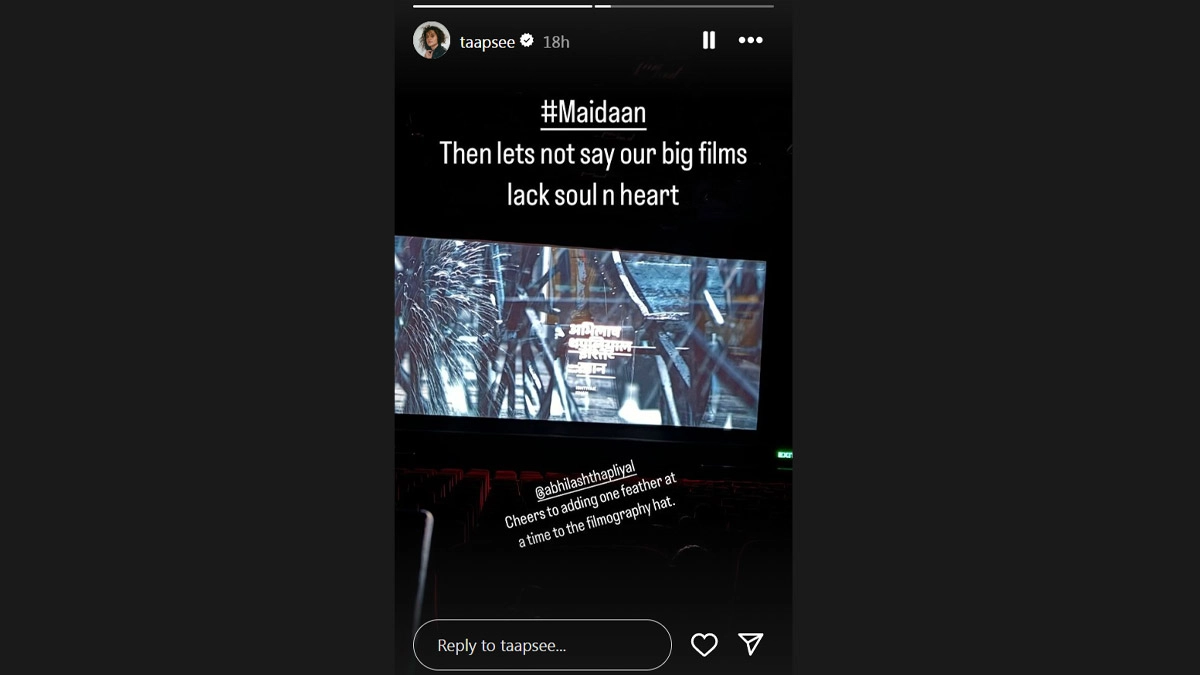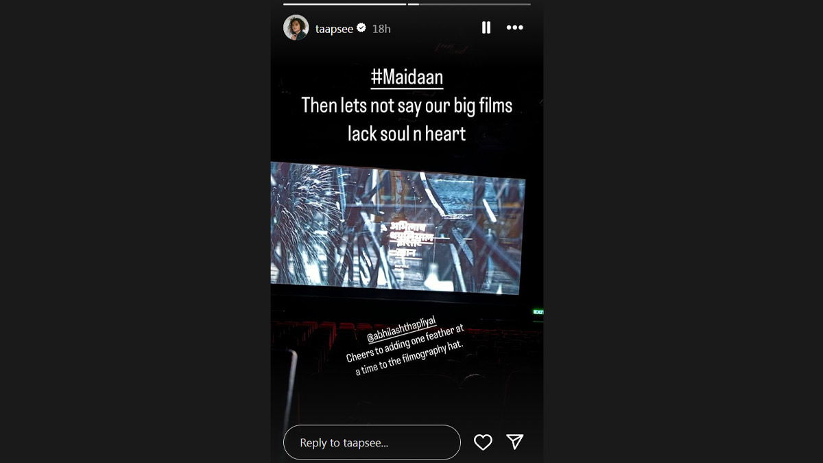 Ajay Devgn-starrer Maidaan has left actor Taapsee Pannu in awe. On Thursday, Taapsee took to Instagram and shared a picture from the theatre. "#Maidaan then lets not say our big films lack soul and heart," she wrote. Taapsee also gave a shout out to her friend Abhilash Thapliyal, who plays a pivotal role in the film. "@abhilashthapliyal cheers to adding one feather at a time to the filmography hat," she added. Many other stars including Shahid Kapoor, Karan Johar and Varun Dhawan also took to their Instagram Stories to share their opinion about the film. Maidaan Box Office Hit or Flop: 5 Reasons Why Ajay Devgn Has Failed to Replicate Shaitaan’s Success With His Sports Drama.