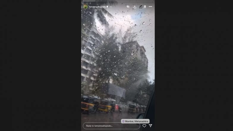 Actor Tamannaah Bhatia gave her fans a delightful peek into her day as she enjoys the Mumbai rains. The actress on Wednesday, took to her Instagram Stories to share a series of pictures and a video, capturing her joy during the downpour. In the first picture, raindrops can be seen on her car window, setting a serene mood. Paparazzi Call Vijay Varma and Tamannaah Bhatia the ‘Best Couple’ Upon Spotting Them Together Outside a Mumbai Multiplex (Watch Video).