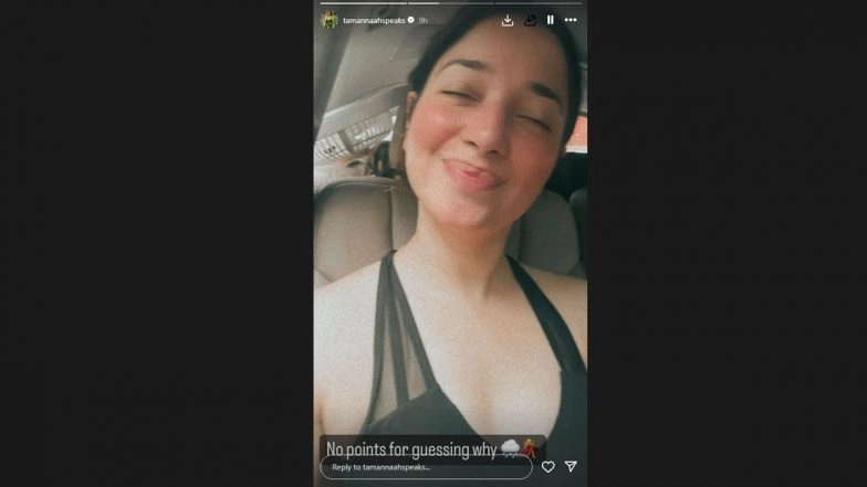 The next story featured a selfie of Tamannaah radiantly happy after witnessing the Mumbai rains. Seated in her car with a broad smile, she added a playful caption that read, "No points for guessing why," accompanied by a cloud and dancing emoji.