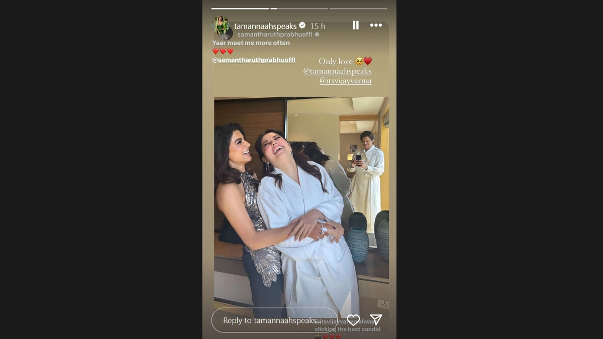 Actors Tamannaah Bhatia and Samantha Ruth Prabhu shared some clicks from the Prime Video's event in Mumbai. Samantha dropped some pictures with Tamannaah on her Instagram Story and wrote, "Oh my love @Tamannaahspeaks. This meeting was long overdue."In the picture, they can be seen happily posing for the camera. Another picture showed actor Vijay Varma clicking candid pictures of Tamannaah and Samantha. Samantha shared it and wrote, "Only love @Tamannaahspeaks @itsvijayvarma."Citadel - Honey Bunny: Varun Dhawan and Samantha Ruth Prabhu's Citadel Spinoff Title Revealed, View New Poster!