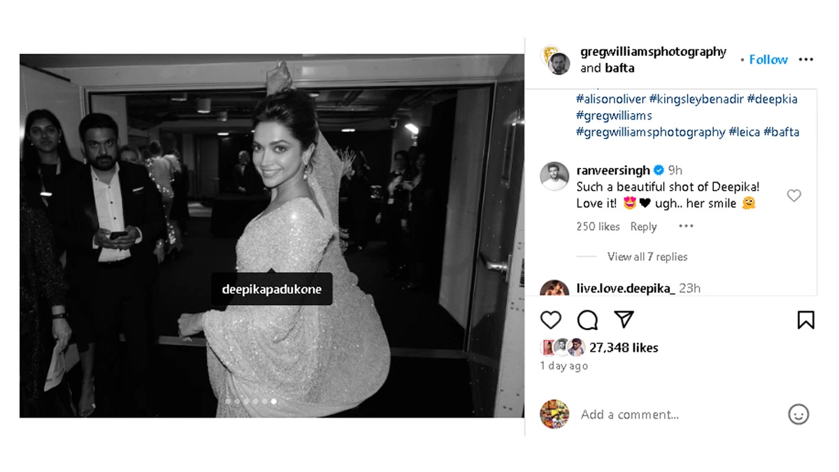 Actor Ranveer Singh never leaves out a chance to praise his wife and actor, Deepika Padukone, both on and off social media. Photographer Greg Williams posted a photo of Deepika on Instagram from the award BAFTA 2024 award ceremony. To which the Don 3 actor wrote in comments, "Such a beautiful shot of Deepika! Love it! ugh.. her smile." Deepika presented the award for the Best Film not in the English language to actor Jonathan Glazer for The Zone Of Interest. The 77th BAFTA Film Awards ceremony was held at London's Royal Festival Hall on February 18. Deepika made heads turn on the red carpet as she donned a golden and silver-hued shimmery saree with sequins all over it. She paired it with a matching blouse with strappy sleeves. Ranveer Singh Opens Up On Bond With Rocky Aur Rani Kii Prem Kahani Director Karan Johar, Says 'We Have Dilli Ki Aunty Within Us'.