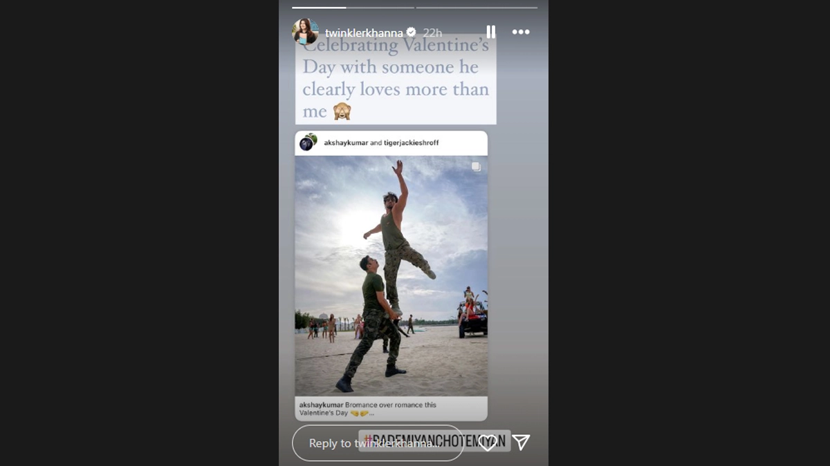 Akshay's wife, Twinkle Khanna, posted Akshay and Tiger's photo on her Instagram Stories and hilariously reacted, "Celebrating Valentine's Day with someone he clearly loves more than me!" with a wink emoji. Akshay and Tiger will be seen sharing screen space in Ali Abbas Zafar's directorial Bade Miyan Chote Miyan. Twinkle Khanna Reveals How Daughter Nitara Got Bit by Pet Dog Freddy and Yet Defended Him; Her Reason Will Win You Over!.