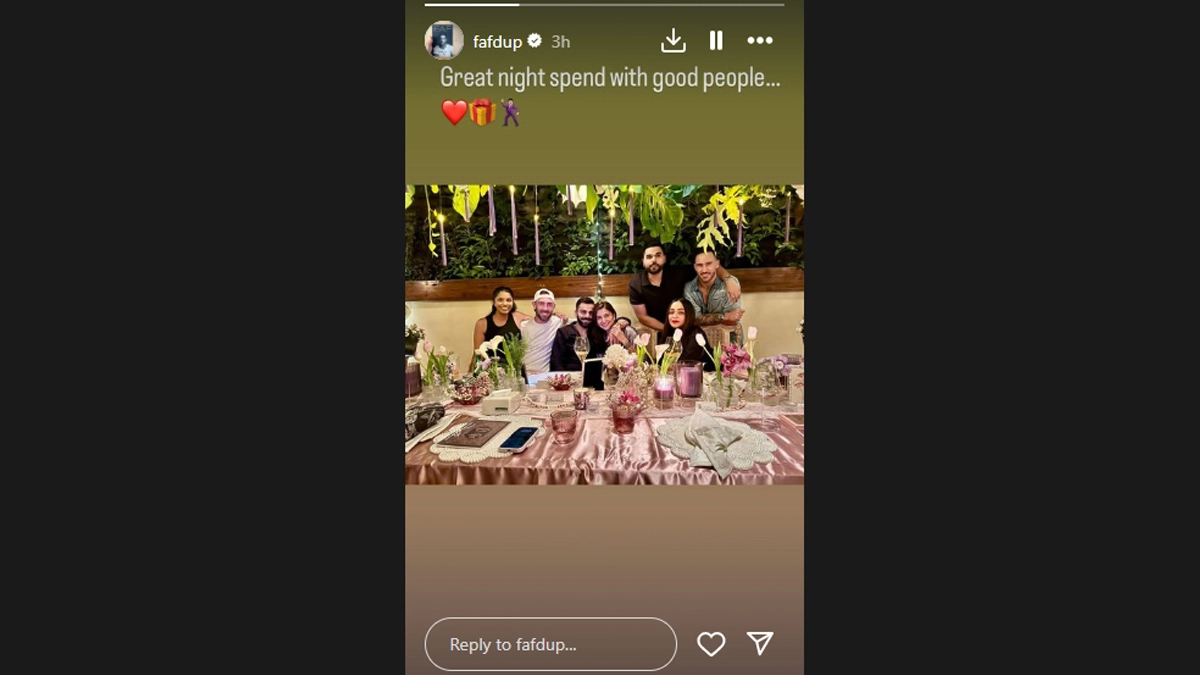 Actor Anushka Sharma had a fun birthday celebration with her husband Virat Kohli and some of his close friends from the RCB squad in Bengaluru. RCB skipper Faf du Plessis took to Instagram Story and shared a picture from Anushka's intimate 36th birthday celebration. The picture shows Virat holding Anushka close as they bonded together over dinner with Faf du Plessis, Glen Maxwell and his wife Vini Raman. "Great night spent with good people," Faf captioned the image. Maxwell reposted the same image. There's also another image from Anushka's birthday which has been doing the rounds on the internet. Shared by renowned chef Manu Chandra, the picture shows Anushka and Virat sharing smiles as they pose with the group. "Shiny happy people + good food = joy. Such a lovely evening this was, made better for this lots absolute love for the pursuit of great nosh. Happy happy birthday @anushkasharma," Chef Manu Chandra wrote in the caption. Anushka Sharma Birthday: Best Saree Looks of the Actress to Admire!.