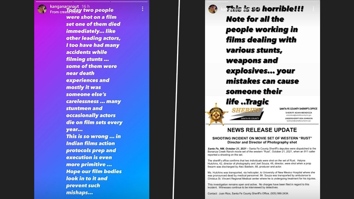 Kangana also recalled her "near death experiences" while filming several action stunts in the films. She added, "Today two people were shot on a film set, one of them died immediately... Like other leading actors, I too have had many accidents while filming stunts... Some of them were near-death experiences and mostly it was someone else's carelessness... Many stuntmen and occasionally actors die on film sets every year... This is so wrong." Alec Baldwin Fatally Kills Cinematographer of His Film 'Rust' With a Prop Gun Fire, Injures Director.