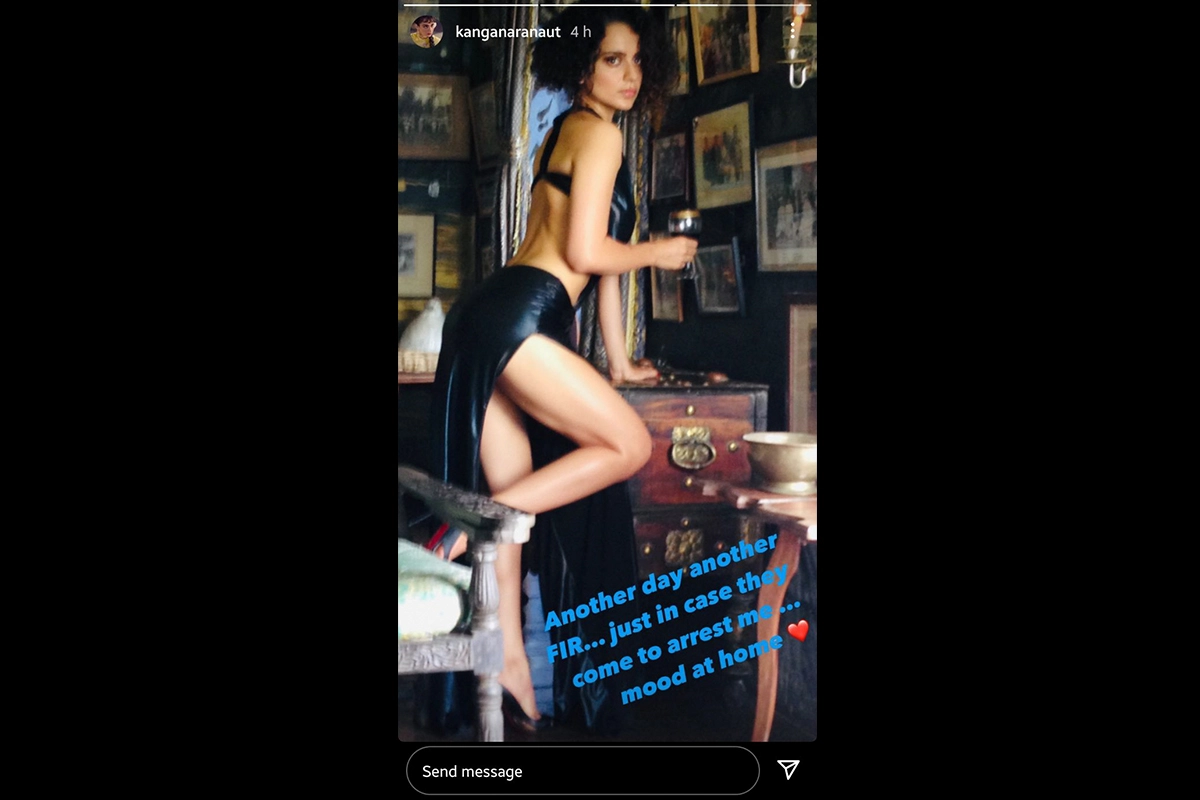 Actor Kangana Ranaut on Wednesday shared her first statement in reaction to the FIR filed against her by Sri Guru Singh Sabha Gurdwara Committee (SGSSGC) for making seditious statements against the Indian state and farmers, on her social media handle. Taking to her Instagram story, Kangana shared a bold picture of herself where she could be seen sporting a sultry dress while holding a wine glass in her hand. Kangana Ranaut Faces Police Complaint Filed By Mumbai's Sri Guru Singh Sabha for Her Objectionable Comments on Sikh Community.
