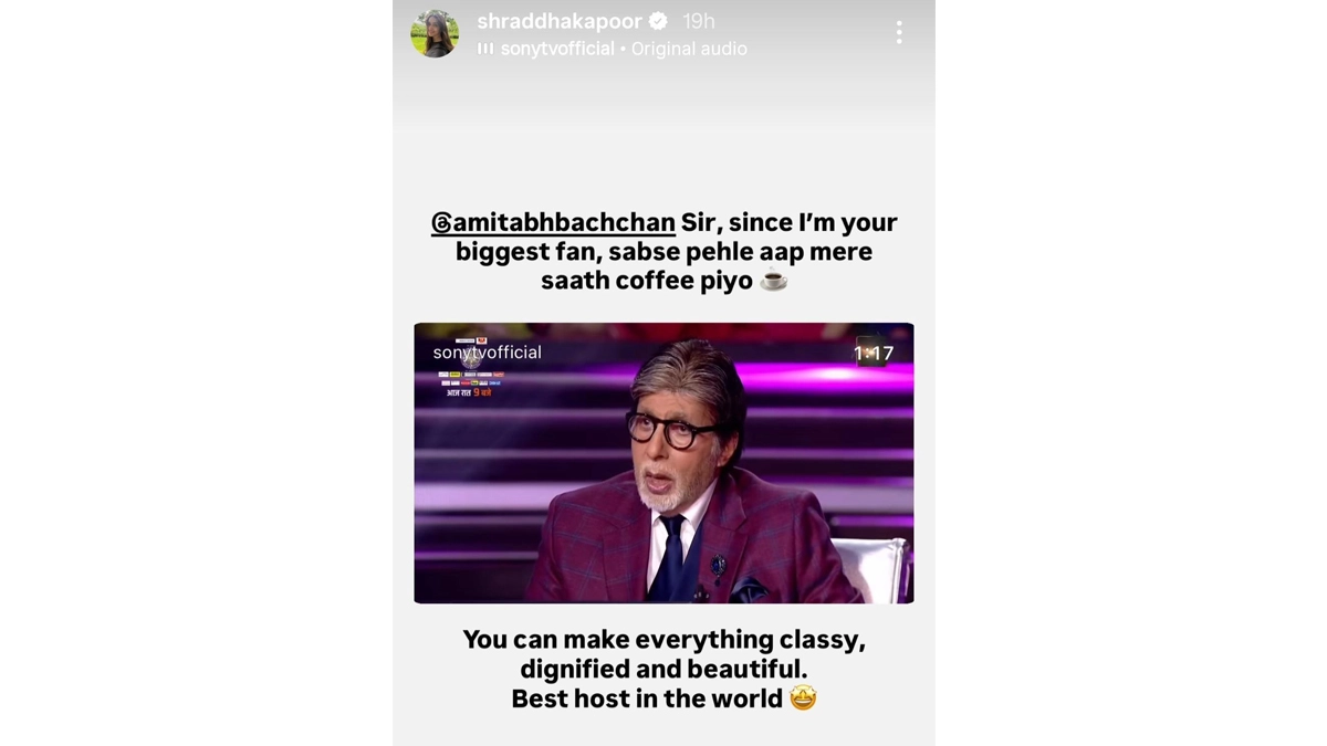 On Instagram, Shraddha Kapoor reshared a video from the latest episode of KBC 17 in which a fan asked Amitabh Bachchan to request that Shraddha Kapoor agree to a coffee date with him, as he claims to be her biggest fan.