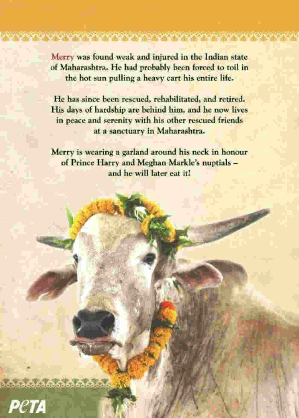 Mumbai, May 19: Ahead of the much-awaited British royal wedding of Prince Harry and Hollywood actress Meghan Markle, animal rights organisation PETA India has decided to gift a bull, named Merry, a hybrid of the name Meghan and Harry, to the couple. Merry, currently residing at a sanctuary in Maharashtra, was found alone and suffering from a deep wound on his neck when he was rescued by People for the Ethical Treatment of Animals (PETA).