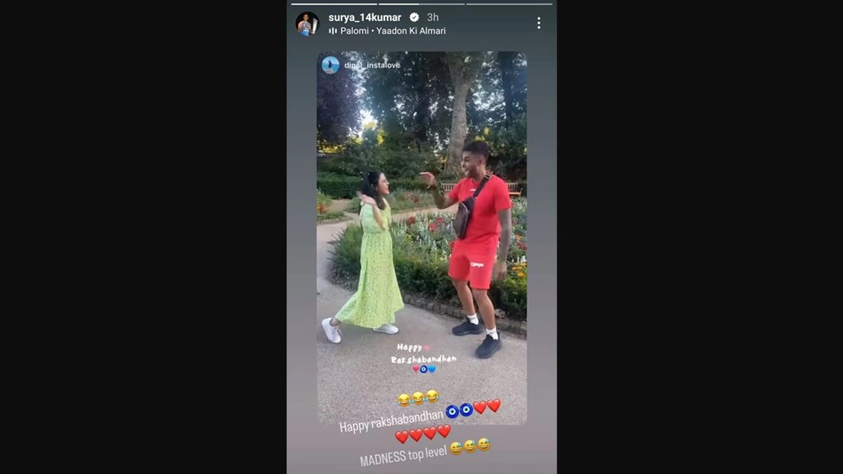 New Delhi [India], August 19: Star India batter Suryakumar Yadav on Monday celebrated the Raksha Bandhan festival with his sister Dinal Yadav. The right-handed batter shared a clip on Instagram where he is giving a high-five to his sister. He also wrote, "Happy rakshabandhan, MADNESS top level." Rohit Sharma Shares Meal With Abhishek Nayar, Dhawal Kulkarni and Other Friends Ahead of IND vs BAN 2024 Test Series (See Post).