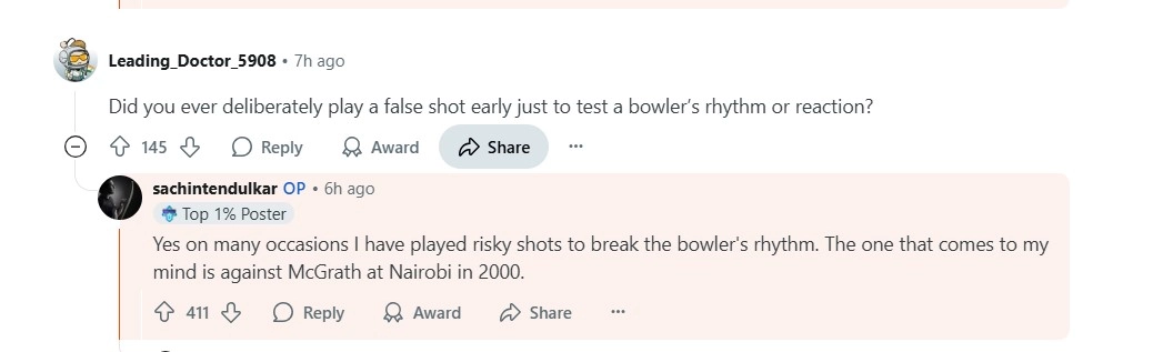Speaking on if he had ever played a false shot to disturb a bowler's rhythm or test his reaction, Sachin said, "Yes, on many occasions I have played risky shots to break the bowler's rhythm. The one that comes to my mind is against McGrath at Nairobi in 2000." The instance Sachin is talking about here was during the quarterfinal of the ICC Champions Trophy against then world champions Australia back in 2000. McGrath, who had been wicketless for the whole tournament, was trying to impose his dominance over the opening pair of Sourav Ganguly and Sachin. Sachin unleashed a brutal assault on McGrath, smashing him for two fours and three sixes in his knock of 38 in 37 balls, with three fours and three sixes.
