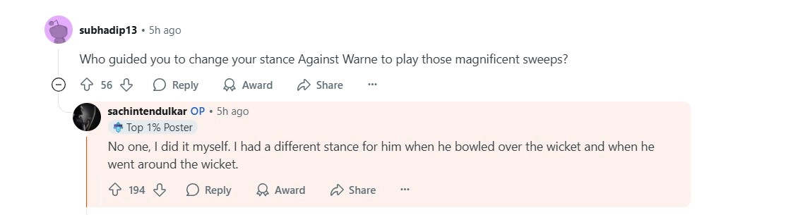 Also, on being asked who guided him to play his sweep shots against legendary leg spinner Warne, once the sport's hottest duel, Sachin said, "No one, I did it myself. I had a different stance for him when he bowled over the wicket and when he went around the wicket." This highlighted Sachin's sheer control and mastery over Warne, a formidable spinner who could turn and make the ball fly at will. In the seven times they faced off, Warne could never get the prized wicket of the Master Blaster and was taken to the cleaners. Sachin scored 123 in 172 balls against Warne at a strike rate of above 71, hitting him for a total of 16 fours and a six.