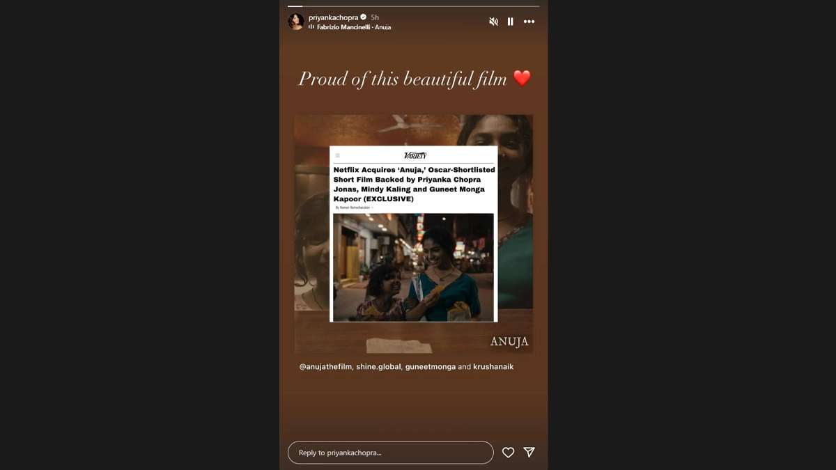 Actress Priyanka Chopra says she is proud of the “beautiful film” Anuja, in which she serves as an executive producer. Priyanka took to her Instagram stories, where she shared a snapshot of a news article from variety.com, which had the title “Netflix Acquires Anuja, Oscar-Shortlisted Short Film Backed by Priyanka Chopra Jonas, Mindy Kaling and Guneet Monga Kapoor”. Priyanka Chopra Joins Oscar-Shortlisted ‘Anuja’ As Executive Producer – Cast, Plot, IMDb Rating – All You Need To Know About the Film.