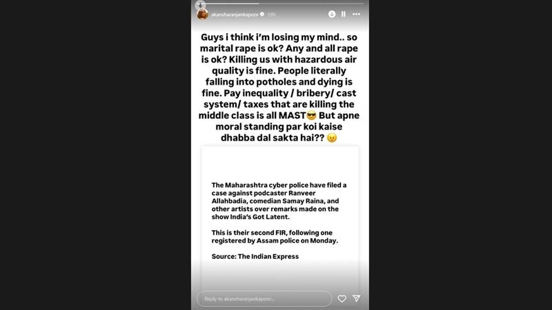 Now, actress Akansha Ranjan Kapoor has voiced her support for Ranveer Allahbadia, Samay Raina and the other creators involved in the controversy. Re-sharing an Instagram post by journalist Faye D’Souza, Akansha expressed her frustration over the legal proceedings, questioning the priorities of authorities. She wrote, “Guys I think I'm losing my mind.. so marital rape is ok? Any and all rape is ok? Killing us with hazardous air quality is fine. People literally falling into potholes and dying is fine. Pay inequality / bribery/cast system/taxes that are killing the middle class is all MAST! But apne moral standing par koi kaise dhabba dal sakta hai?” Ranveer Allahbadia’s Remarks Row: UP Women’s Commission Vice Chairperson Aparna Yadav Urges Centre To Take Action Against YouTubers Making Objectionable Comments.
