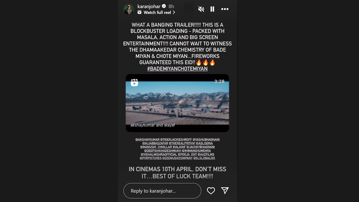 On Wednesday, KJo took to the Stories section of his Instagram and shared the film's trailer. Heaping praise on the film’s team, he wrote: “What a banging trailer! This is a blockbuster loading—packed with masala, action, and big screen entertainment! I can't wait to witness the dhamaakedaar chemistry of Bade Miyan and Chote Miyan. Fireworks guaranteed this Eid #BadeMiyanChoteMiyan.”