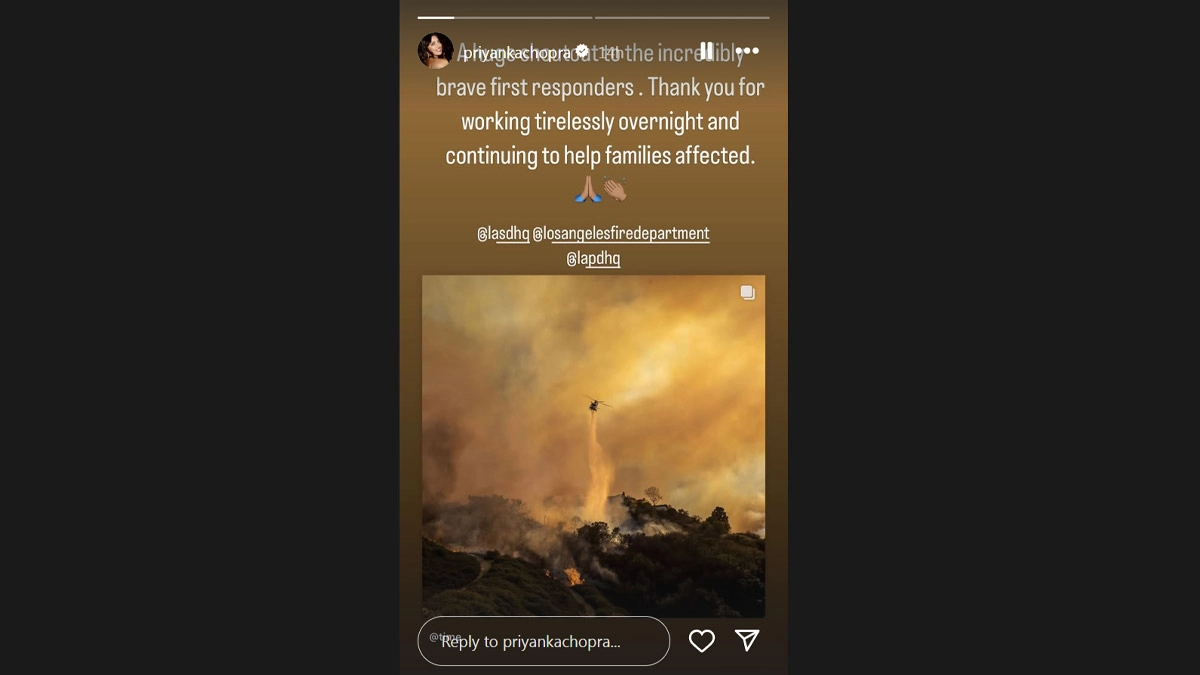 Priyanka took to her Instagram stories, where she shared a post of “first responders” trying to control the wildfire, which has destroyed thousands of acres of land.