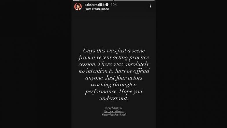 Taking to her Instagram stories on Tuesday (August 5), Sakshi Malik requested fans to calm down because the viral video featuring her and Raghav was a part of an acting workshop. She wrote, "Guys, this was just a scene from a recent acting practice session. There was absolutely not intention to hurt or offend anyone. Just four actors working through a performance. Hope you understand."