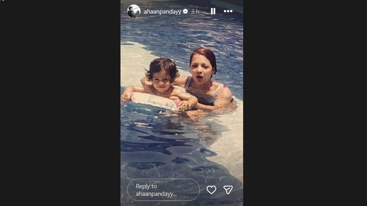 In one photo, Ahaan shared a childhood memory of his mother teaching him how to swim. Young Ahaan can be seen in the pool with a baby float, while his mother, Deanne Panday, holds him close, helping him learn to move through the water.