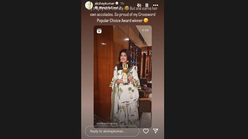 Akshay took to his Instagram stories section, where he posted a picture of Twinkle holding the trophy and posing for a photograph.
