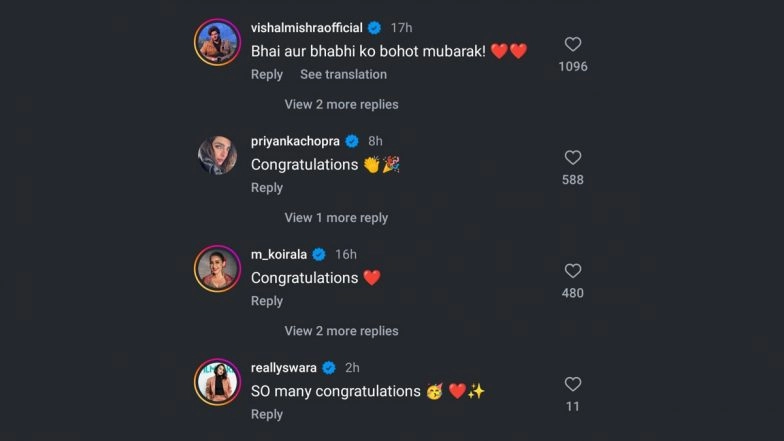 Priyanka Chopra, Manisha Koirala, Vishal Mishra and Swara Bhasker Congratulate the Couple