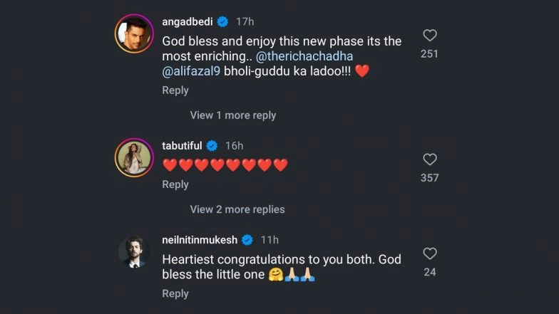 The post featured an adorable photo of their newborn girl's feet. Sharing the heartwarming image, they wrote, "Doing a collab post to announce the biggest collab of our lives!! We’ve been blessed indeed. Our baby girl continues to keep us very very busy. So, Thank you all for your love and blessings." As soon as the photo was shared, B-Town celebs, including Priyanka Chopra, Manisha Koirala, Taapsee Pannu, Dia Mirza, Shriya Pilgaonkar, Konkona Sensharma, Tabu, Kalki Koechlin showered love on their baby girl. PeeCee wrote, "Congratulations" while Tabu expressed her joy with a bunch of heart emojis. Richa Chadha and Ali Fazal Blessed With Baby Girl; Couple Releases Statement on Arrival of Their First Child.