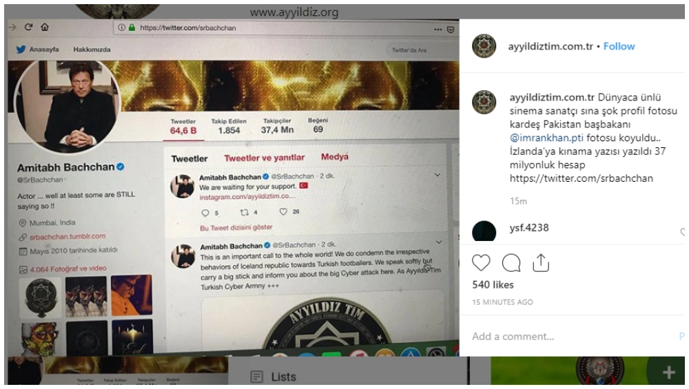 The latest target of a group of Turkish hackers is Amitabh Bachchan's Twitter account. The group of hackers known as Ayyildiz Tim gained access to Big B's account and tried to spread their propaganda. Amitabh's display picture was changed to that of Pakistani Prime Minister Imran Khan. The bio was updated to read "I love Pakistan" with an added flag of Turkey. "This is an important call to the whole world! We do condemn the irrespective behaviors of Iceland republic towards Turkish footballers. We speak softly but carry a big stick and inform you about the big Cyber attack here. As Ayyıldız Tim Turkish Cyber Armny," the hackers tweeted from Amitabh's account.