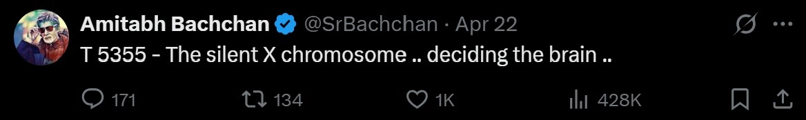 The intrigue began on 22 April, when Bachchan shared a cryptic post: "The silent X chromosome... deciding the brain." While scientifically accurate - men have one X chromosome while women have two, with one typically remaining inactive - the relevance of this statement remains unclear.