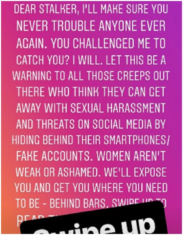 She also put up a warning for the stalker on her Instagram that she will not take the matter lying down.