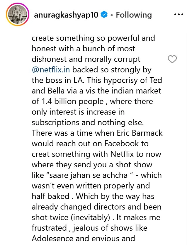 While Kashyap’s admiration for Adolescence was effusive, his tone shifted sharply when he turned his attention to Netflix India. Referring to the post by Ted Sarandos, in which the Netflix Global CEO praised shows that "push into brand-new territories, defy the limits of creativity, and feature career-defining performances," Kashyap expressed hope that Sarandos genuinely meant those words. However, he lamented that Netflix India’s reality was starkly different.
