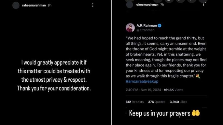 AR Rahman's daughter, Raheema Rahman, also took to her Instagram handle and reacted to the announcement. She wrote, "I would greatly appreciate it if this matter could be treated with the utmost privacy and respect. Thank you for your consideration." In her next story, she reshared AR Rahman's statement and wrote, "Keep us in your prayers." After Wife Saira Banu, AR Rahman Posts Statement on Their Separation Ending With #ARRSairaaBreakup; Breakup Hashtag Leaves Netizens Confused and Amused.