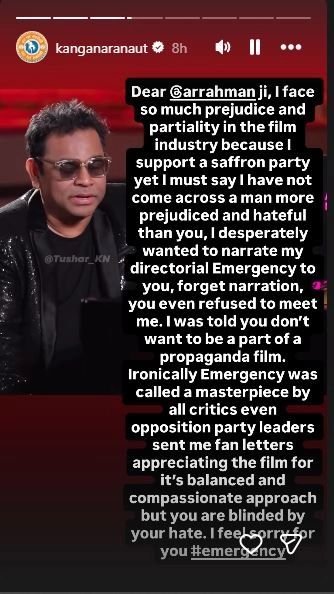 Kangana's post on Instagram Stories went like this, "Dear @arrahman ji, I face so much prejudice and partiality in the film industry because I support a saffron party yet I must say I have not come across a man more prejudiced and hateful than you, I desperately wanted to narrate my directorial Emergency to you, forget narration, you even refused to meet me. I was told you don't want to be a part of a propaganda film. (sic)" Javed Akhtar Rules Out ‘Communal Element’ in AR Rahman’s ‘Power Shift’ Comment (Watch Video).