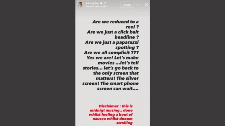 The director pointed out that while most celebrities have been reduced to mere social media reels, clickbait headlines, and paparazzi spotting, it is time that one shifts their focus from the smartphone screen to the screen that counts - the silver screen. Excited to create good cinema in the future, KJo wrote on his Instagram Stories, "Are we reduced to a reel? Are we just a clickbait headline? Are we just a paparazzi spotting? Are we all complicit??? Yes we are ! Let's make movies... let's tell stories...let's go back to the only screen that matters! The silver screen! The smart phone screen can wait...(sic)."
