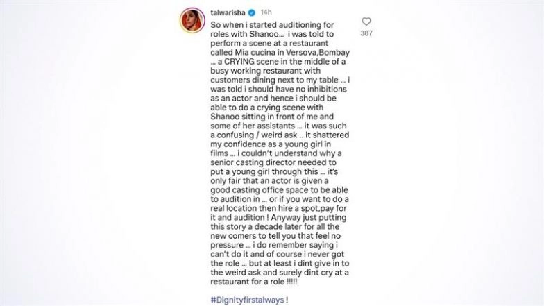 Isha questioned the purpose of asking her to give the audition in an unprofessional setting. She added that a casting director should always provide a proper space for talents to give their auditions, just to make sure that they are comfortable and deliver their best. Isha further wrote that she disagreed with the audition and has zero regrets about not getting the role.
