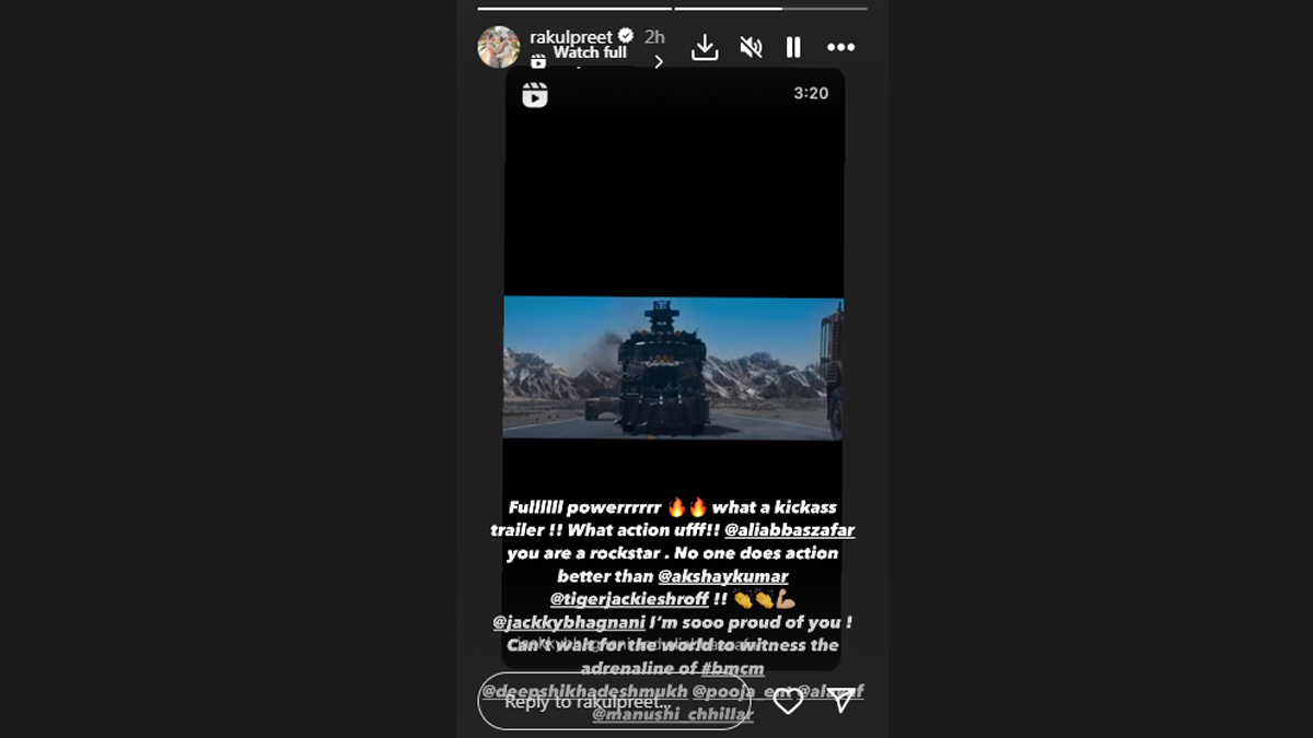 Akshay Kumar and Tiger Shroff's Bade Miyan Chote Miyan is one of the most-awaited films of the year. The makers released the action-packed trailer today, and netizens have responded well. Rakul Preet Singh took to her Instagram Stories to share her review and expressed her pride in her husband and BMCM producer Jackky Bhagnani. Bade Miyan Chote Miyan Trailer: Akshay Kumar and Tiger Shroff Team Up to Take On Prithviraj Sukumaran in Ali Abbas Zafar’s Action-Packed Film (Watch Video).