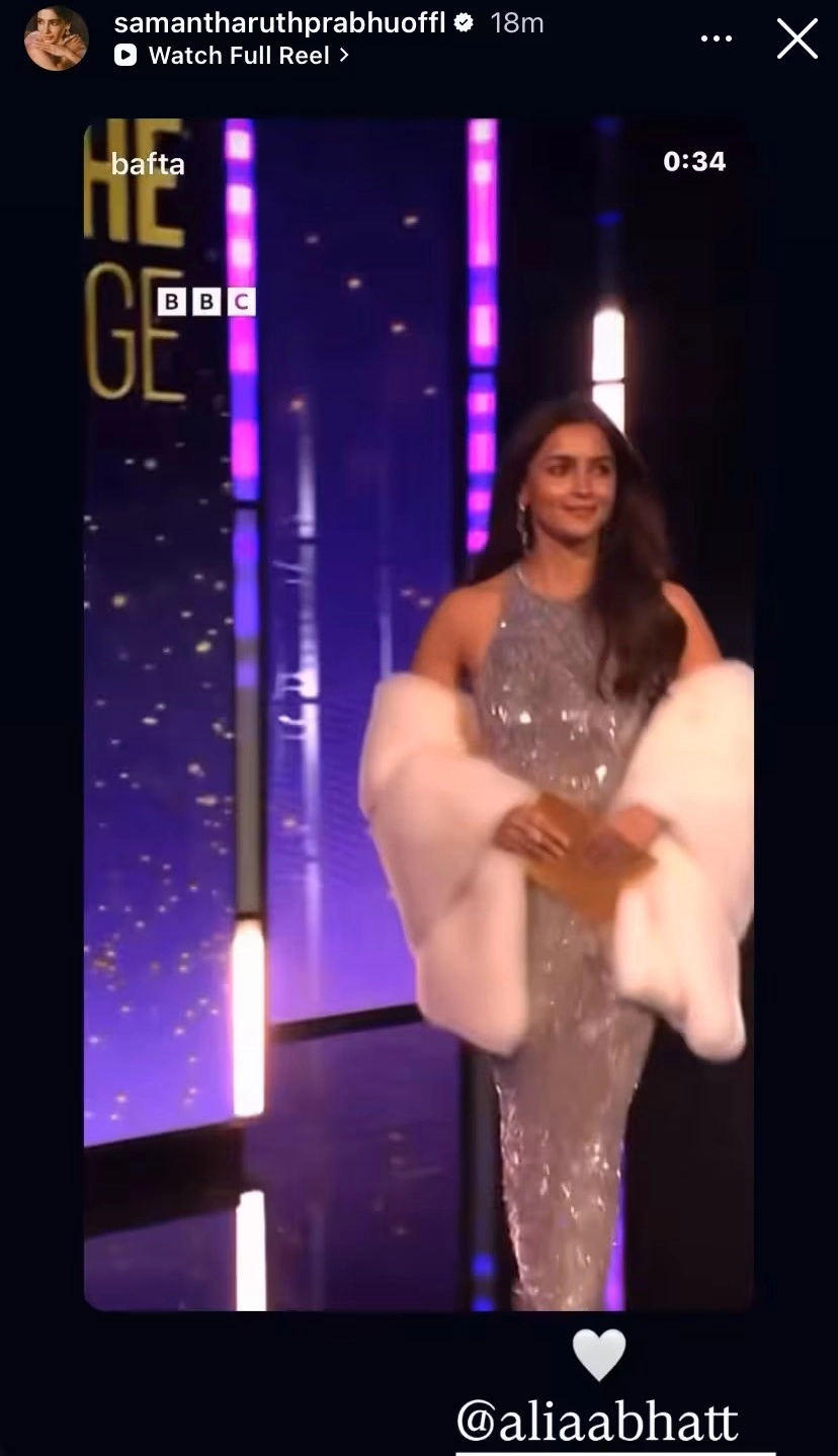 Samantha Ruth Prabhu reposts video of Alia Bhatt at BAFTAs 2026 (Photo Credit: @samantharuthprabhuoffl/Instagram)