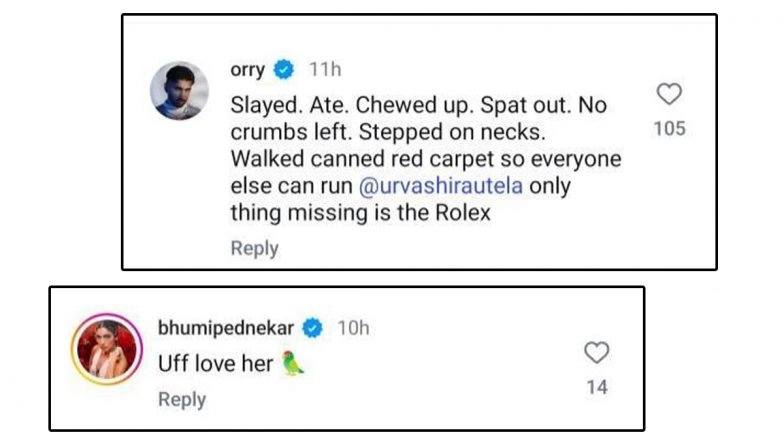 Bhumi Pednekar and Orry also shared their thoughts on Urvashi Rautela's Cannes 2025 look, and they seemed to absolutely love it. Orry wrote, "Slayed. Ate. Chewed up. Spat out. No crumbs left. Stepped on necks. Walked canned red carpet so everyone else can run @urvashirautela. The only thing missing is the Rolex." On the other hand, Bhumi Pednekar wrote, "Uff love her (parrot emoji)."