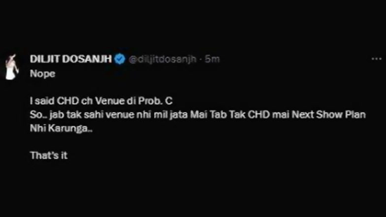 In a now-deleted post on X (previously Twitter), Diljit Dosanjh offered clarification about the statement he made during the Chandigarh concert and wrote, "Nope. I said CHD ch Venue di prob C. So jab take sahi venue nahi mil jata main tab take CHD mein next show plan nahi karunga. Thats it." (I meant that the problem was with Chandigarh. So, I said that till the time I get a proper venue in Chandigarh, I will not plan another performance in the city). Singer Guru Randhawa Takes a Dig at Diljit Dosanjh, Posts ‘Punjab’ With Indian Flag Emoji.