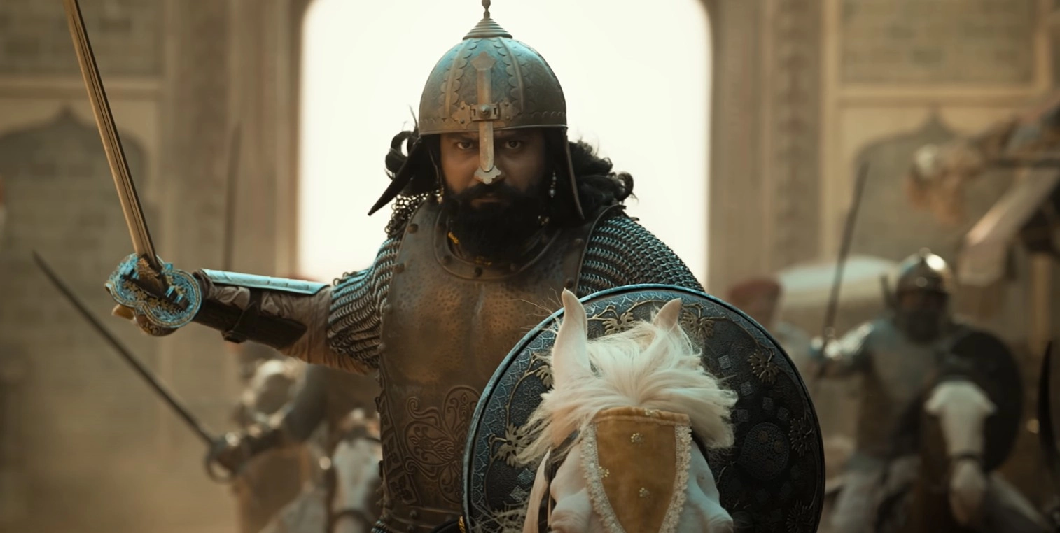 That’s not to say the film doesn’t attempt to show an intimate side to Sambhaji Maharaj. There are scenes where he shares heartfelt conversations with his confidante and wife, Maharani Yesubai (Rashmika Mandanna, playing yet another dutiful biwi role). These moments take a strange turn when Yesubai, hearing of Sambhaji’s lack of maternal love, wishes for him to be reborn as her son in his next life (?!). There are also repeated scenes of Sambhaji imagining himself as a child in peril, guided by his father’s voice. Yet, these feel more like filler than a genuine exploration of the king’s emotional psyche.