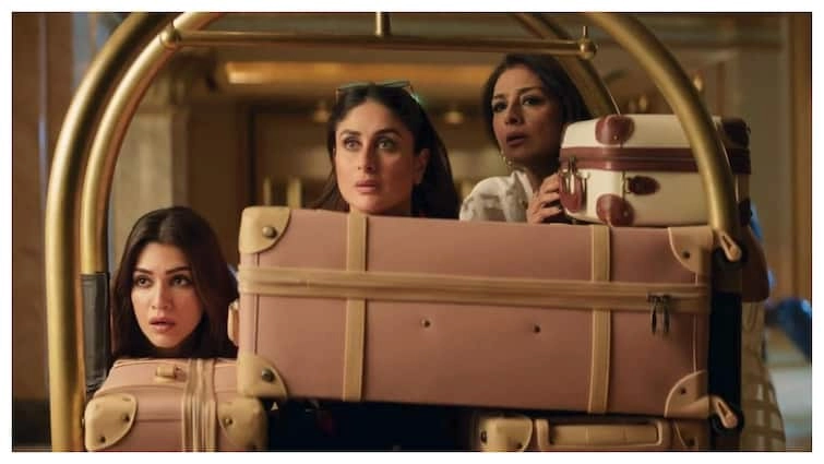 Crew Movie Review: Sparkle is good, but too much sparkle is injurious to your eyes. When you bring three talented and beautiful actresses like Tabu, Kareena Kapoor Khan, and Kriti Sanon and cast them in a glammed-up fun heist film, expectations soar high. Crew, directed by Rajesh Krishnan (of Lootcase fame), has a smooth takeoff and even cruises mid-way in the same manner, albeit with some minor turbulence in between. But it is the landing where the film screws it up disappointingly, despite the combined fun energy of three actresses trying hard to spice things up. Crew First Song ‘Naina’ Out! Tabu, Kareena Kapoor and Kriti Sanon Exude Slay Vibes in This Groovy Track by Diljit Dosanjh.
